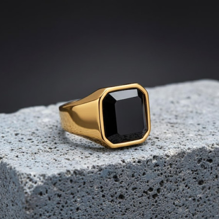 Design: A "New Deco" style signet ring with a geometric, emerald-cut stone.