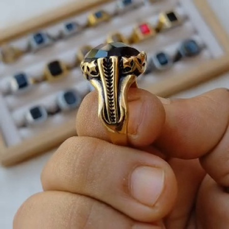 Gemstone: Features a faceted natural black onyx stone, typically in an oval or round shape.